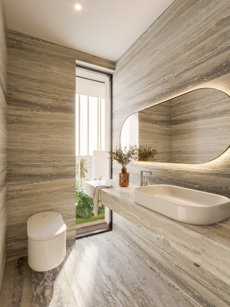 The architectural design offers a striking blend of organic curves and modern, straight lines, creating a visually captivating façade. Each floor flows seamlessly into the next, accentuated by lush greenery and private pools that enhance the luxurious feel of the building.